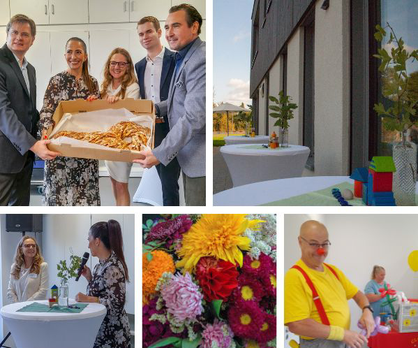 Den Auftakt der Eröffnungsfeier bildete das Grußwort der Schirmherrin und Sozialreferentin der Stadt Würzburg Dr. Hülya Düber. Im Anschluss folgten Reden und Dankesworte von Wolfgang Trosbach und Martina Sponholz, dem Vorstandsvorsitzenden und der Geschäftsleitung der Lebenshilfe Würzburg e.V.. Auch das Leitungsteam des »Haus am Bach«, bestehend aus von Marion Weis und Julia König, richtete einige Worte an die Anwesenden. Nach der Ansprache von Bauherr Prof. Dr. Boris Zimmermann folgte schließlich die symbolische Schlüsselübergabe des Architekturbüros Pollach am das »Haus am Bach«. Die beiden großen Schlüssel, die Inhaber Sebastian Pollach und Architekt Tobias Hensel mitgebracht hatten, bestanden aus Hefeteig und Nussfüllung und fanden großen Anklang unter den Gästen.