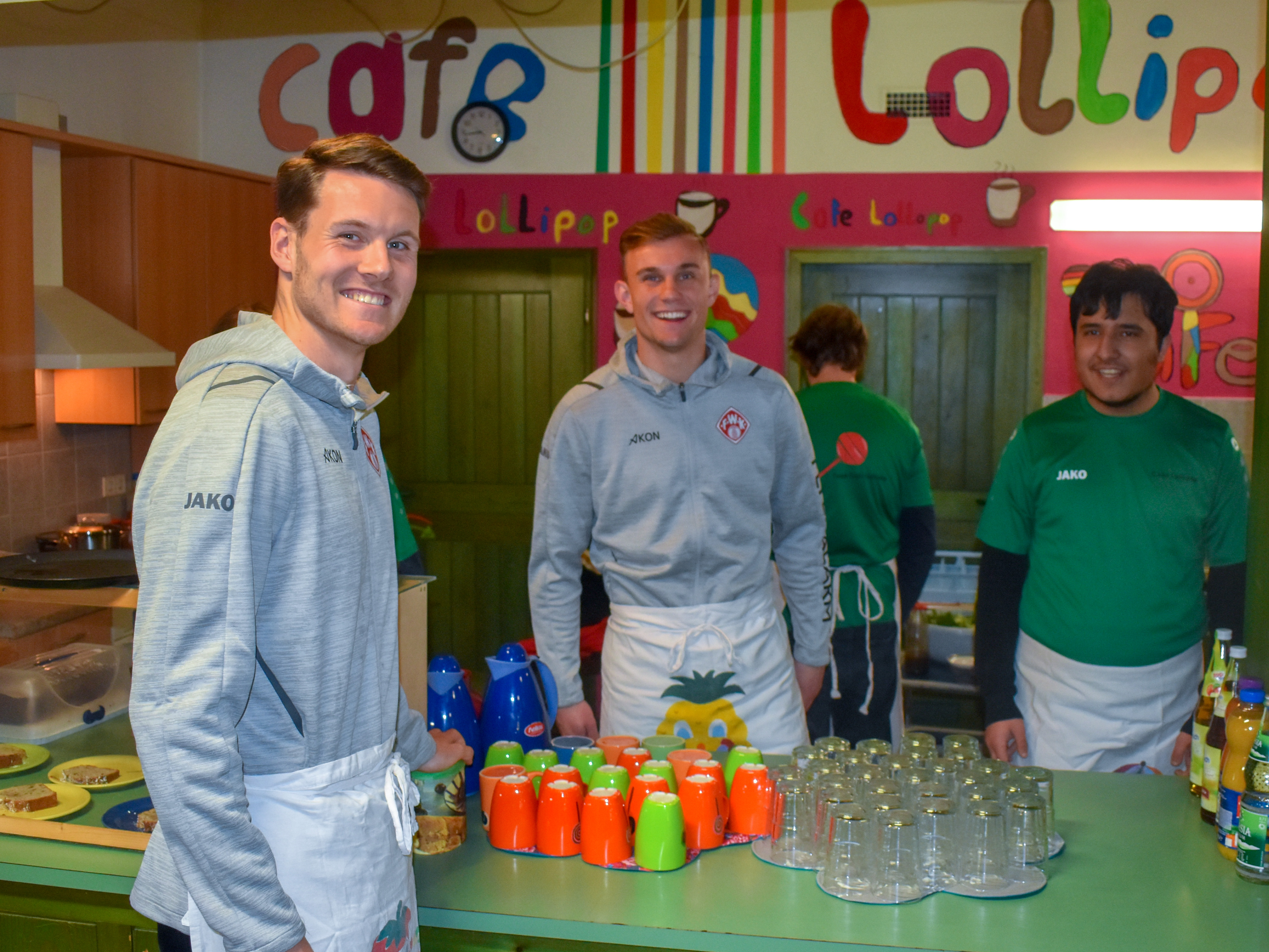 Auftakt der Aktionswoche war der Welt-Downsyndrom-Tag am 21. März. Spannend wurde es für die Schüler*innen der Christophorus-Schule am Dienstag: Lukas Müller, Thomas Haas und Felix Göttlicher von den Kickers waren zu Gast im schuleigenen Café Lollipop und packten beim Verkauf, hinter der Theke und bei der Bewirtung vieler hungriger Gäste ordentlich mit an.