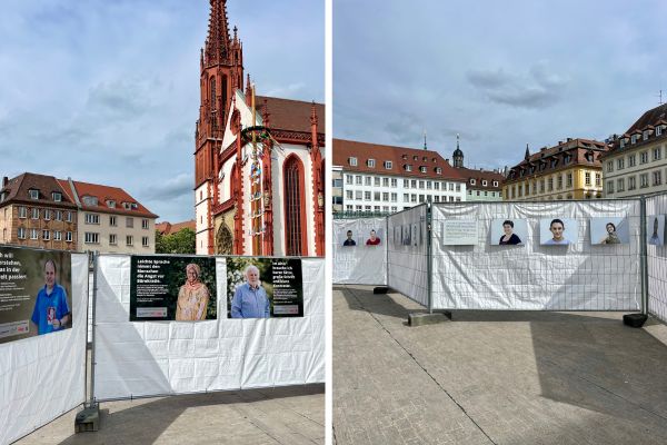 Der Marktplatz verwandelte sich in eine Ausstellungsfläche, auf der an Bauzäunen verschiedene Beiträge präsentiert wurden. Die Lebenshilfe Würzburg beteiligte sich mit zwei Ausstellungen an der Aktion: